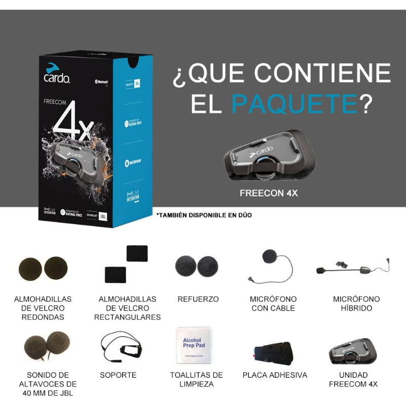 Cardo Freecom 4X Duo es un kit de intercomunicación Bluetooth para casco con dos unidades. El sistema admite comunicación entre hasta 4 dispositivos y alcance de hasta 1,2 km, según las condiciones de uso. Integra Bluetooth 5.2 y tecnología Live Intercom. Cada unidad incluye altavoces JBL de 40 mm, dos canales Bluetooth para conexión con teléfono móvil, navegador GPS u otros equipos compatibles, radio FM con memoria de emisoras y puerto USB Tipo C. La batería ofrece hasta 13 horas de tiempo de conversación y la carga de 20 minutos añade hasta 2 horas de conversación. El equipo dispone de control por voz y actualización de software inalámbrica. El conjunto incluye dos módulos Freecom 4X, altavoces, micrófonos, elementos de montaje para casco, cables y documentación.