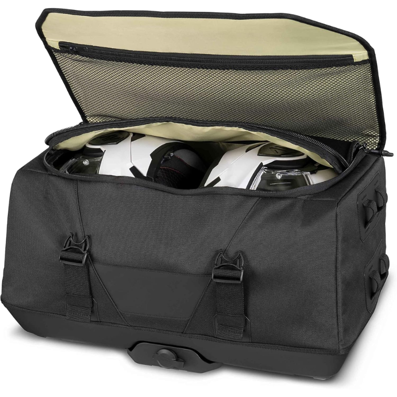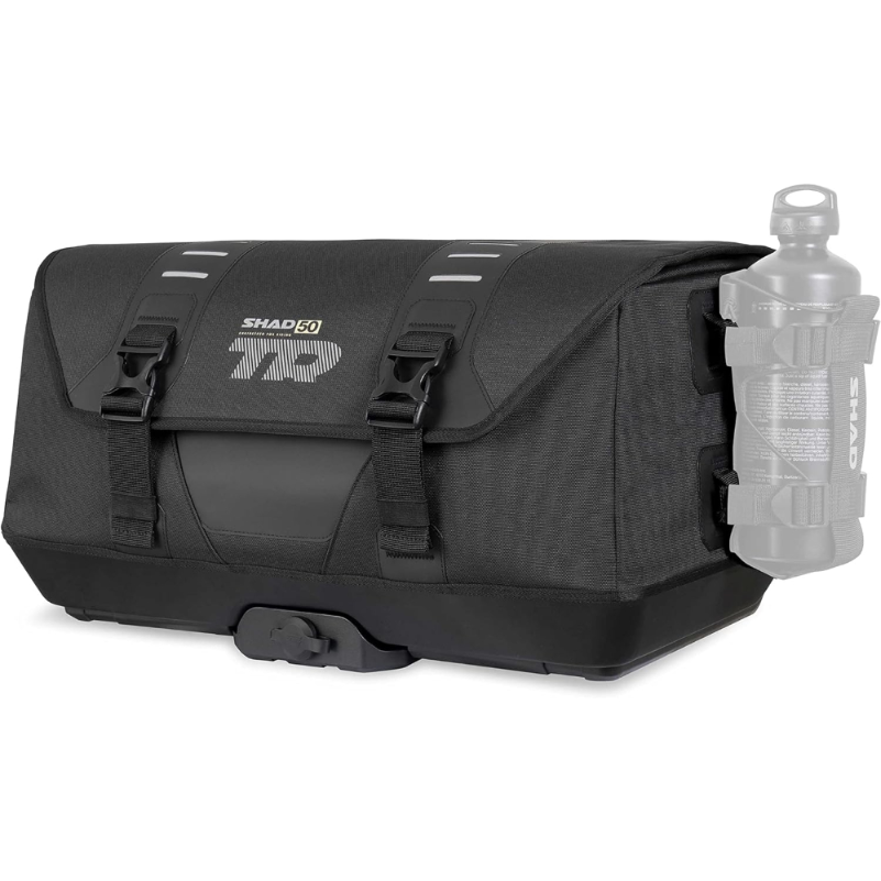 Bolsa trasera SHAD TR50 con capacidad de 40 litros para instalación en la parte posterior de la motocicleta. Capacidad de carga máxima: 10 kg. Construcción textil con compartimento principal, bolsa interior impermeable y sistema exterior MOLLE para acoplar módulos compatibles. Fijación mediante correas y varios puntos de anclaje situados en la base. Incluye asas de transporte y correa para hombro. El exterior incorpora elementos reflectantes. Materiales con certificación REACH y OEKO-TEX Standard 100. Diseñada para transporte de equipaje en moto sobre asiento trasero o portaequipajes, según el sistema de anclaje utilizado.